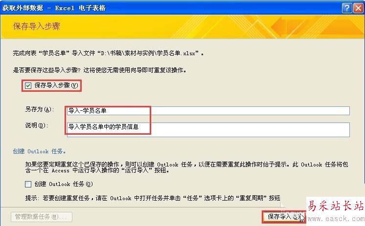 10、彈出是否要保存導入步驟的界面,勾選“保存導入步驟”復選框,在“說明”文本框中輸入必要的說明信息,單擊“保存導入”按鈕,完成導入數據和保存導入步驟。