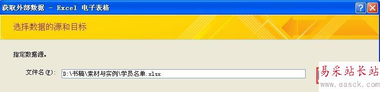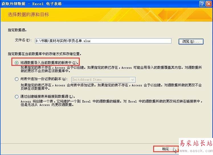 4、在“獲取外部數據-Excel電子表格”對話框中選擇“將源數據導入當前數據庫的新表中”單選鈕,單擊“確定”按鈕。