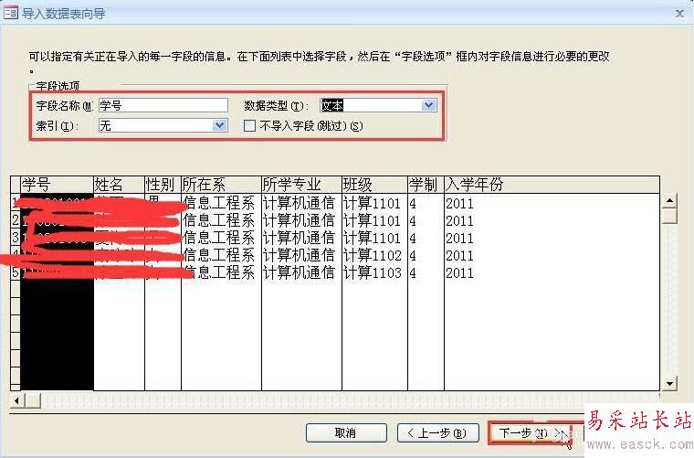 7、彈出指定字段界面,單擊下方預覽窗格中的各個列,可以在上面顯示相應的字段信息,設置字段名稱、數據類型等參數,最后單擊“下一步”按鈕。