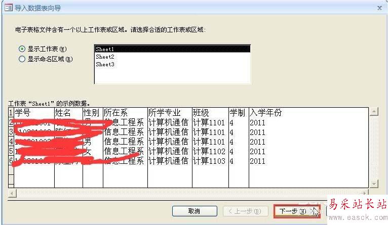 5、彈出“導入數據表向導”對話框,可以看到該Excel電子表格中共有3張Sheet表,我們選擇“顯示工作表”單選鈕和“Sheet1”選項,單擊“下一步”按鈕。