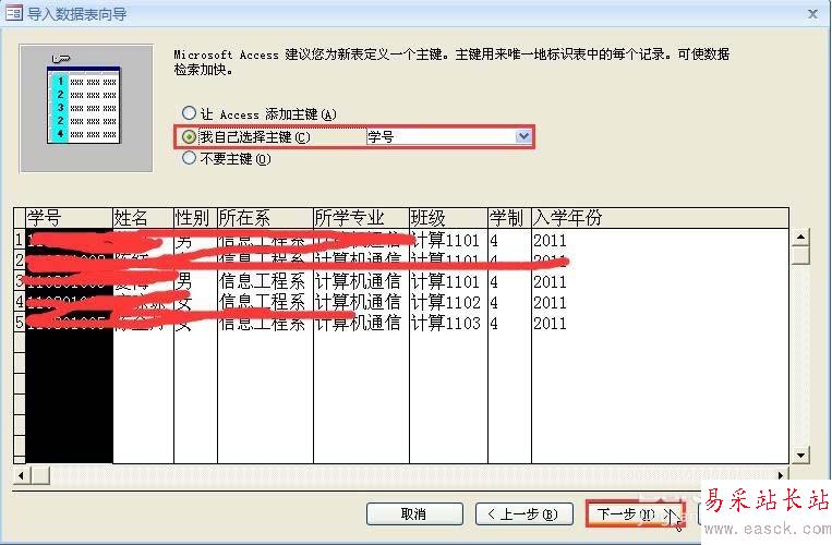 8、彈出設置主鍵界面,選中“我自己選擇主鍵”單選鈕,并在右側的下拉列表中選擇“學號”字段,然后單擊“下一步”按鈕。