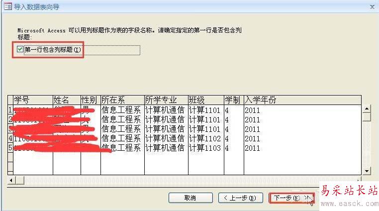 6、彈出選定字段名稱的界面,勾選“第一行包含列標題”復選框,然后單擊“下一步”按鈕。