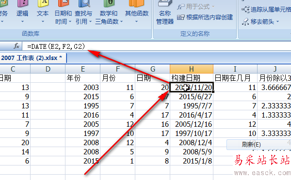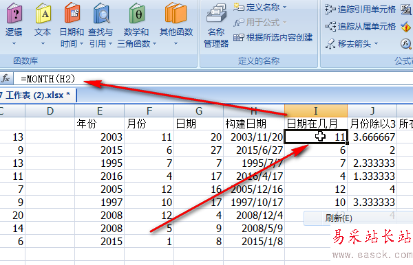 5、用產生的月份除以3,得到一列數據x。如果我們讓這列數據x向上舍入最近的整數的話,就是我們要的季度數啦。