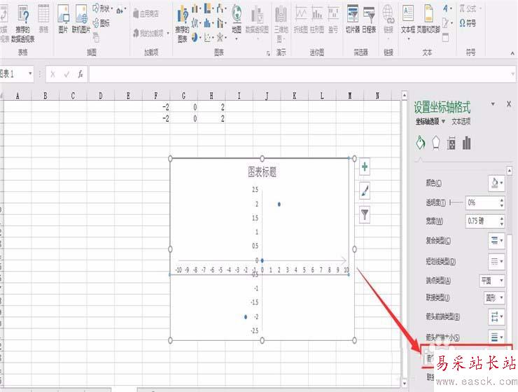 5、設置橫軸的線條寬度,“箭頭末端類型”修改為向右的箭頭,設置縱軸箭頭為向右(即向上)。