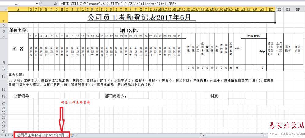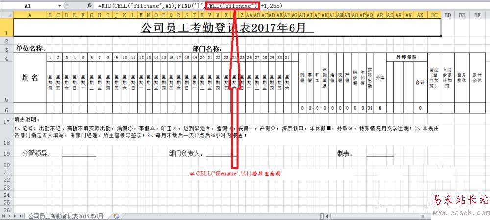 2、其次來看具體表示,1、公式=Cell("filename",A1)。取得A1單元格對應工作表名稱(帶路徑),比如文件為:D:/我的文檔/員工考勤表.xls,工作表為:公司員工考勤登記表2017年6月 。