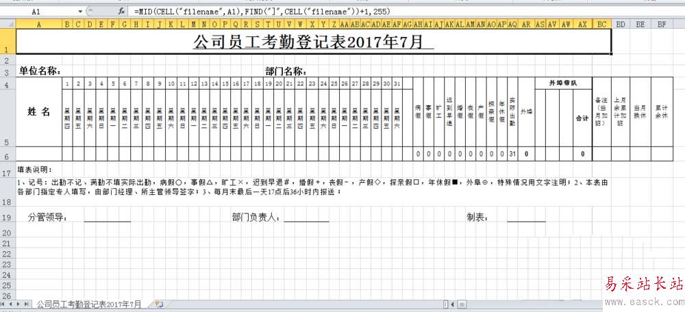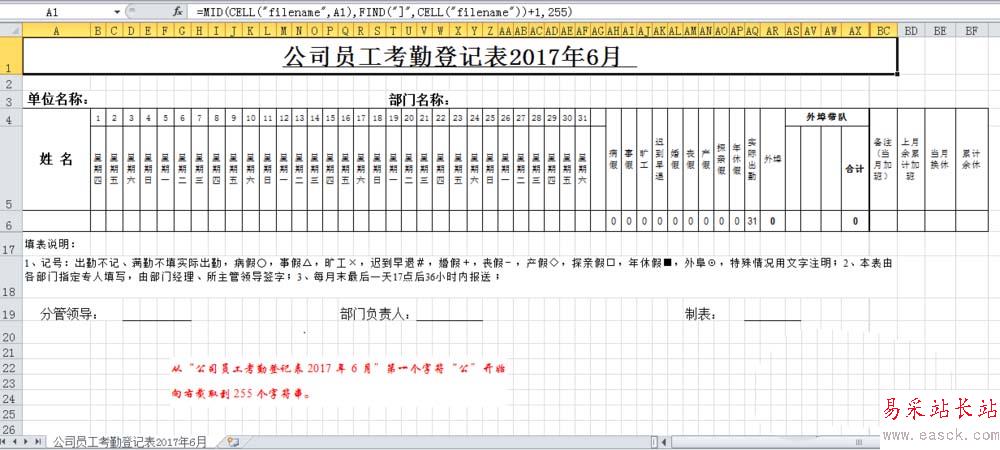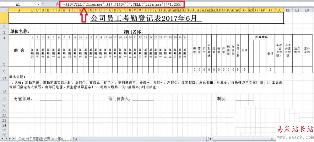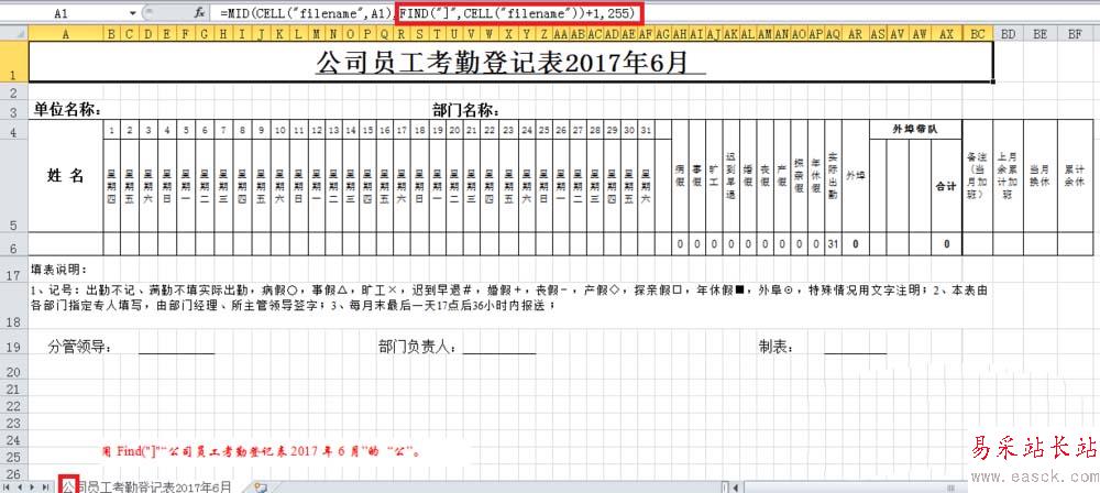 3、公式=FIND("]")。用Find("]"是可以定位工作表名稱“公司員工考勤登記表2017年6月”的前一個字符,即為“公”。
