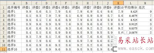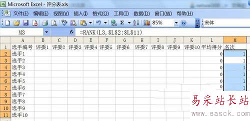 1、我們新建一個工作表,命名為評分表,按照下圖的格式設置好表頭,單元格A1為選手編號,B1中為評委1,用自動填充的方法完成評委2至評委10的數據,B1:K1對應為評委1到評委10。在L1中輸入平均得分,M1中輸入名次。