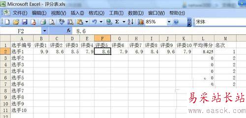 6、接下來我們錄入其他選手的數據。大家看平均得分全部自動求出,名次也是自動錄入會自動排出。