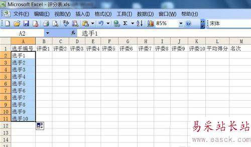 2、在A2中輸入“選手1”,并將鼠標置于被選中的A2單元格右下角的“十”字(即填充柄)上,按住鼠標左鍵向下拖動到A11,這樣就快速地輸入了參賽選手的序號。選手越多,這種自動填充方法的優勢越明顯。