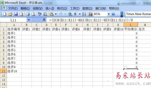 3、在L2單元格中輸入公式 " =(SUM(B2:K2)-MAX(B2:K2)-MIN(B2:K2))/8 ” ,這個公式的意思就是求10個評分的總分,再減去評委的中最高分和最低分,再除以8;算出的結果為0,因為現在前面都還沒有分數。再用自動填充功能復制其他選手的平均得分。