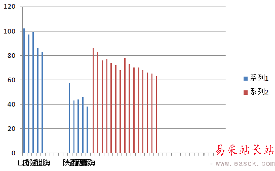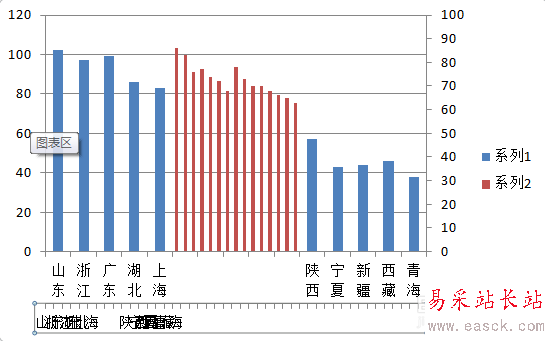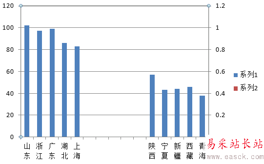 4、這時候需要設置需要被壓縮的數據為“次坐標軸”顯示。步驟:選中需要壓縮顯示的數據 - 右鍵“設置數據系列格式”- 系列選項 - 系列繪制在“次坐標軸”,得到下圖,這時候我們看到這部分數據顯示的內容消失了,需要通過下個步驟來恢復。