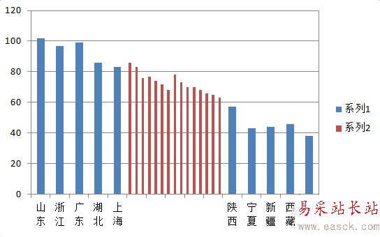 8、美化步驟:去掉圖例,調整背景顏色為淺灰,柱形圖顏色填充為天藍,去除不必要的橫坐標刻度等步驟,可得到下圖。