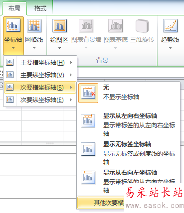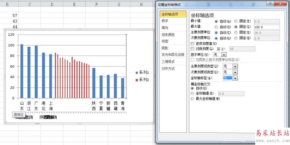 7、選中橫坐標下方一欄“次坐標軸 水平(類別)軸”,右鍵設置坐標軸格式,主要刻度線類型、次要刻度線類型和坐標軸標簽設置為“無”,“線條顏色”設置為“無線條”,然后基本已經得到手風琴柱形圖的樣圖了,后續是一系列美化和優化的步驟。
