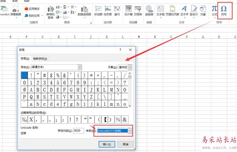 3、在彈出的符號對話框中,看到右下方的“來自”,點擊向下箭頭在彈出的幾個選項中單機選擇“ASCII十進制”,對話框中的符號就顯示的是十進制的符號。