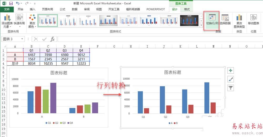 (2)在“圖表工具”菜單的“設計”選項卡中可以通過“切換行列”按鈕對圖表的行和列進行轉換,實現正確的數據圖表呈現方式;