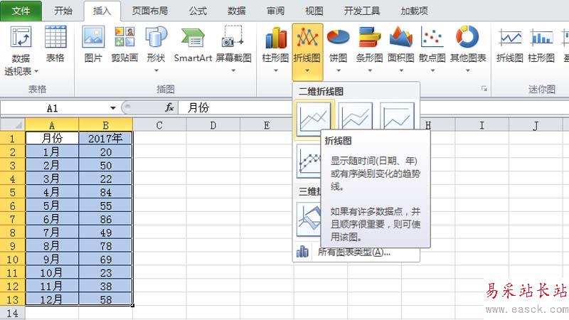 2、選擇數(shù)據(jù)區(qū)域a1:b13,執(zhí)行插入-折線圖命令,從下拉菜單中選擇第一個(gè)折線圖,接著在工作表中就會(huì)自動(dòng)出現(xiàn)一個(gè)折線圖。