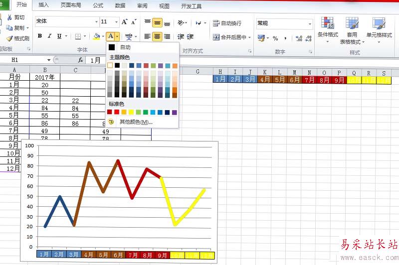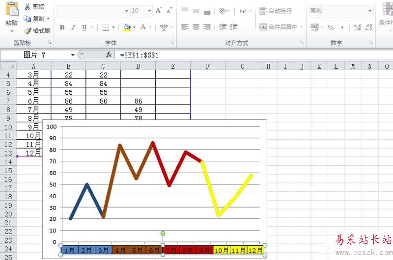 按不同季度顯示不同顏色的折線圖,其制作方法比較復(fù)雜,現(xiàn)在就把制作的步驟和截圖分享出來(lái),供大家參考使用,同時(shí)也希望你能夠分享更多優(yōu)質(zhì)經(jīng)驗(yàn)。