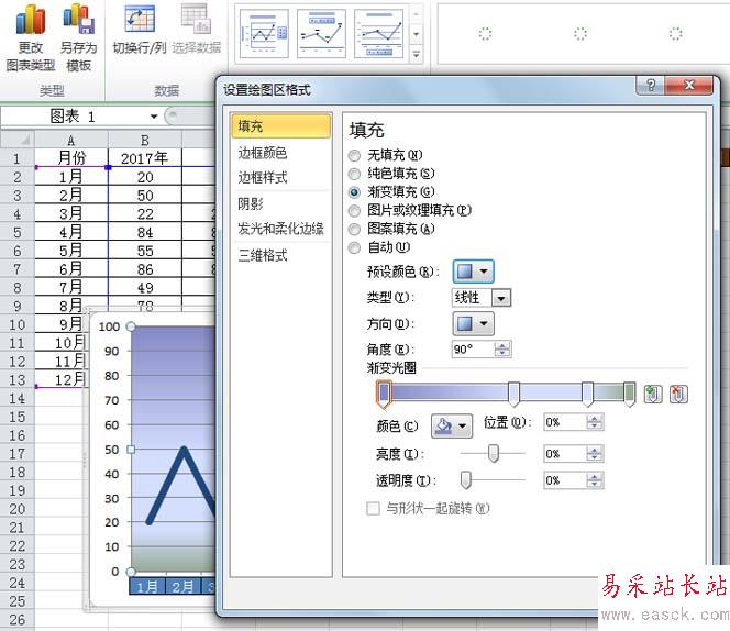 9、右鍵單擊該圖表,從下拉菜單中選擇設(shè)置繪圖區(qū)格式選項(xiàng),設(shè)置填充為漸變填充,設(shè)置自己喜歡的漸變顏色,點(diǎn)擊確定按鈕。