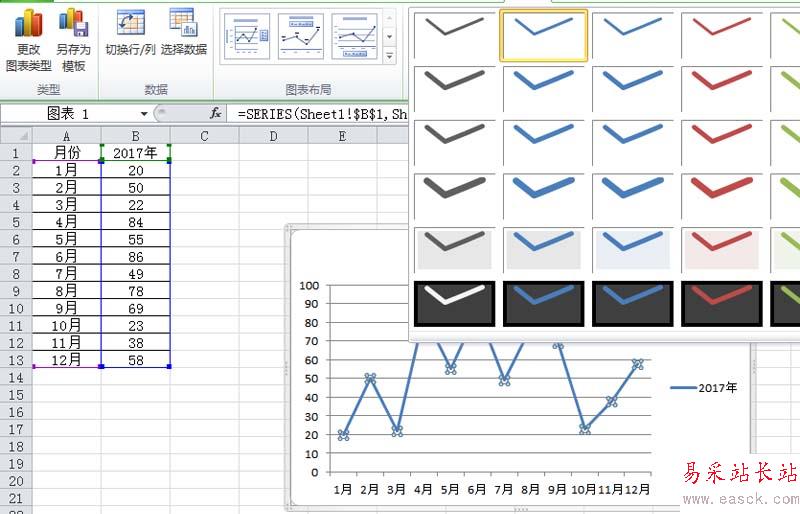 3、選擇折線執(zhí)行設(shè)計(jì)菜單,從圖表樣式中選擇某一個(gè)樣式,接著在c2中輸入=b2公式,然后填充到單元格c13,接著再填充到e13,做一個(gè)參照。