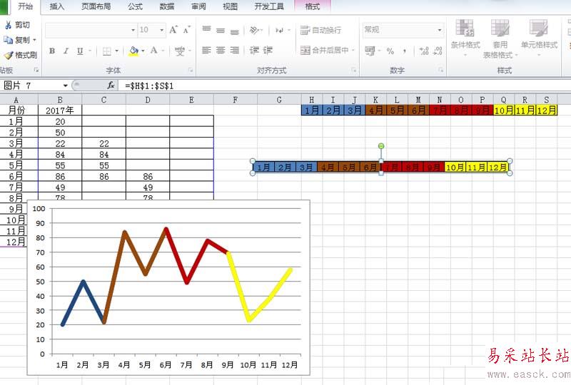7、接著選擇剛才得到的圖片拖拽到圖表的月份上,蓋住原來(lái)的月份,這樣就和上面折線圖的顏色對(duì)于起來(lái)了。