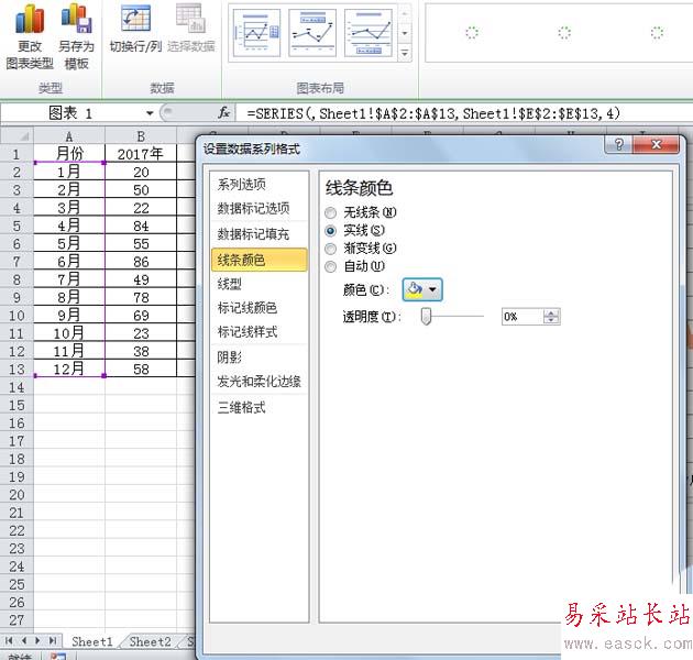 5、分別選擇不同系列折線,右鍵單擊,從下拉菜單中選擇設(shè)置數(shù)據(jù)系列格式選項(xiàng),在彈出的對(duì)話框中設(shè)置不同的線條顏色。