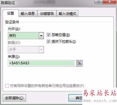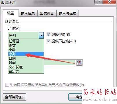 3、在“允許”下框中選擇“序列”在來(lái)源中選擇制作下拉菜單的內(nèi)容