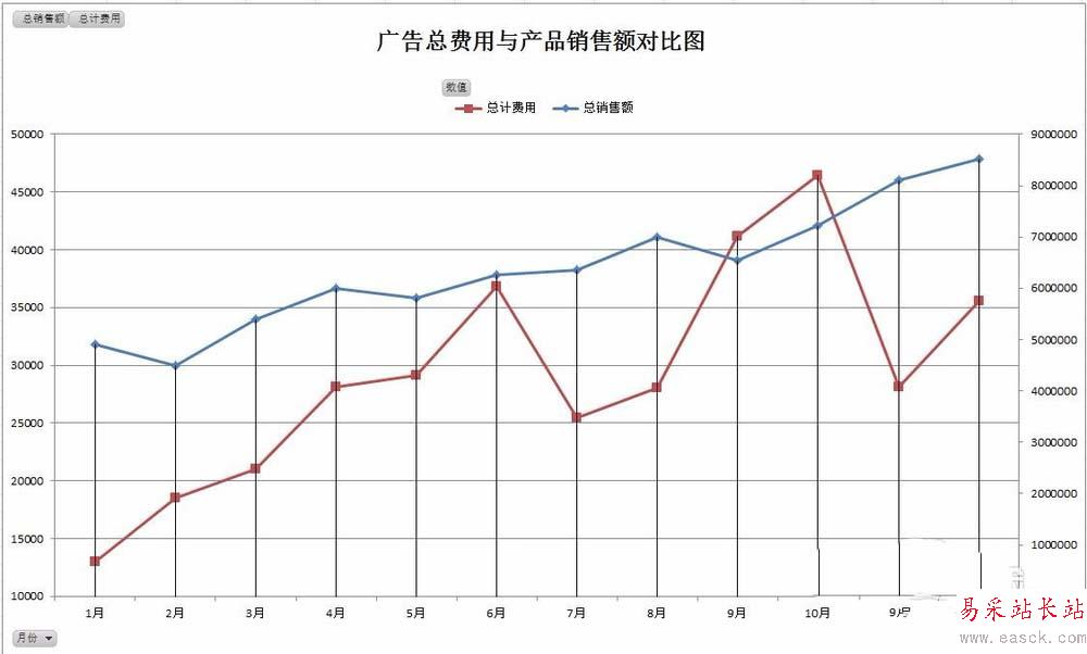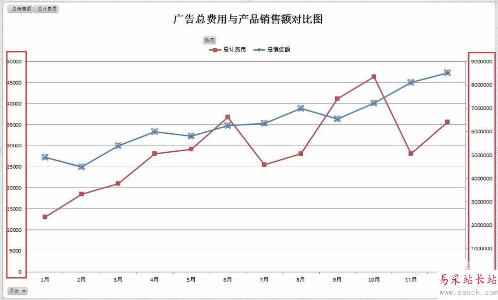 1、總銷售額和總計費用在數值大小差異過大,如果做在同一張圖表共用一個坐標軸,數據將無法正常顯示,此時我們需要用兩個坐標軸分別表示兩組數據,如圖下所示: