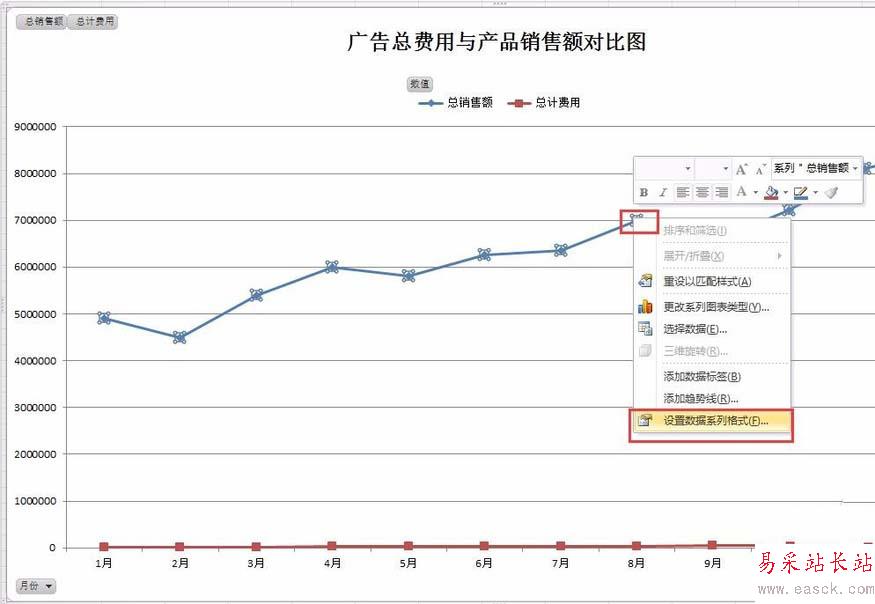 2、選中“總銷售額數量”線(藍色線條),鼠標右鍵單擊,然后選擇“設置數據系列格式”。如圖下所示: