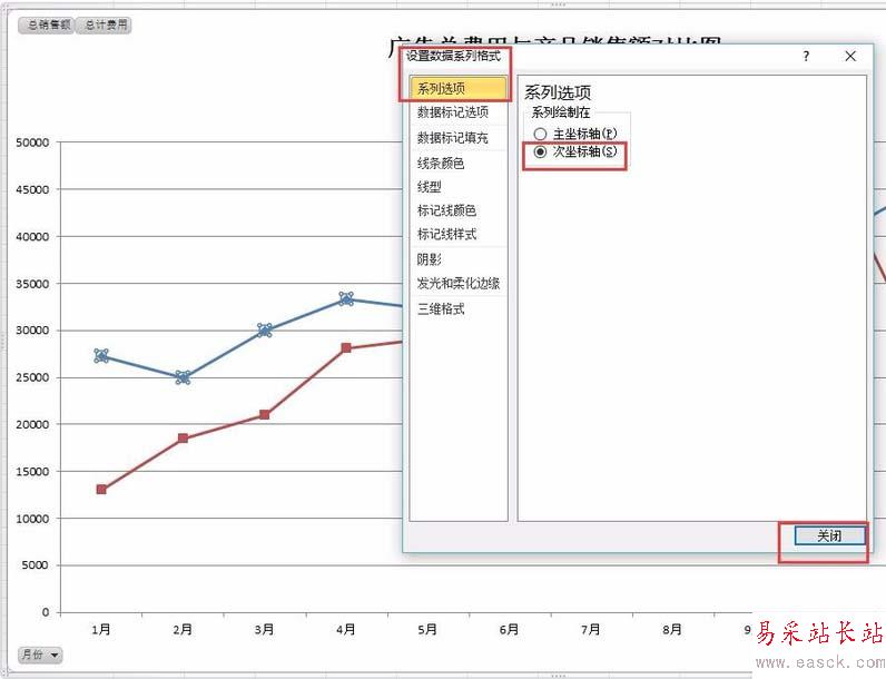 3、打開“設置數據系列格式”對話框,在“系列選項”,選項區域中選中“次坐標軸”單選按鈕,最后點擊“關閉”。如圖下所示: