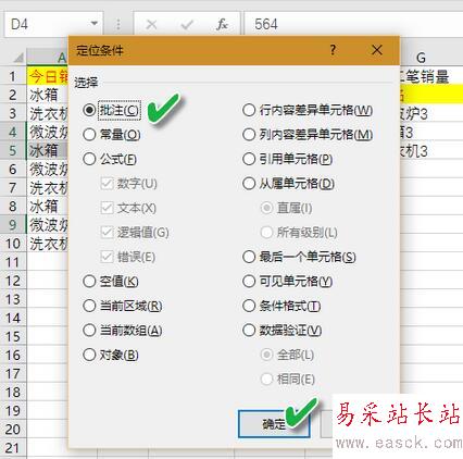 我們只需按下F5后,在定位條件窗口中選擇“批注”并確定,這樣所有含批注的單元格都會被選中,不論表格有多大都能依次找出。