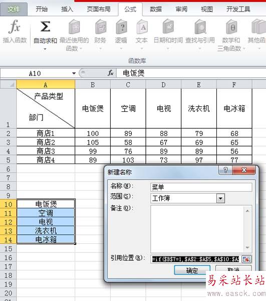 6、執(zhí)行公式-名稱管理器命令,在彈出的對(duì)話框中點(diǎn)擊新建按鈕,彈出新建對(duì)話框,在該對(duì)話框中輸入名稱為“菜單”,引用位置輸入=if($B$7=1,$A$2:$A$5,$A$10:$A$14),點(diǎn)擊確定按鈕。
