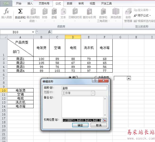9、采用步驟8建立一個(gè)名稱為“坐標(biāo)”,引用位置為=if($B$7=1,$A$10:$A$14,$A$2:$A$5)名稱管理器。