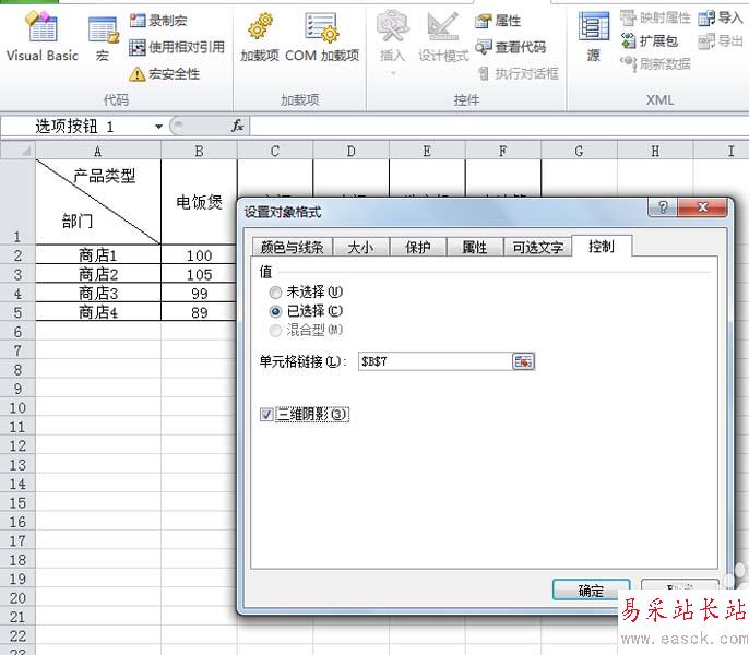 4、右鍵單擊部門選項(xiàng)按鈕,從下拉菜單中選擇設(shè)置控件格式選項(xiàng),接著彈出設(shè)置控件格式對(duì)話框,在該對(duì)話框中設(shè)置單元格鏈接為$B$7,勾選三維陰影,點(diǎn)擊確定按鈕。