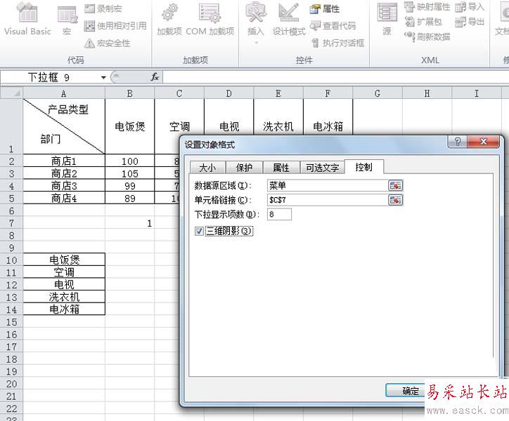 7、執(zhí)行開(kāi)發(fā)工具-插入-組合框命令,在sheet1上創(chuàng)建一個(gè)組合框,右鍵單擊該組合框從下拉菜單中選擇設(shè)置控件格式選項(xiàng),在彈出的對(duì)話框中設(shè)置數(shù)據(jù)源區(qū)域?yàn)椴藛危瑔卧矜溄訛?C$7,勾選三維陰影,點(diǎn)擊確定按鈕。