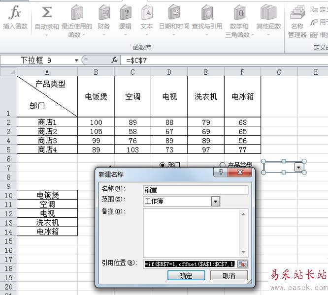 8、再次執(zhí)行工具-名稱管理器命令,在彈出的對(duì)話框中點(diǎn)擊新建命令,接著彈出另一個(gè)對(duì)話框,輸入名稱為“銷量”,引用位置輸入=if($B$7=1,offset($A$1:$C$7,1,1,5),offset($A$1,1,A$7,4,1)),點(diǎn)擊確定按鈕。
