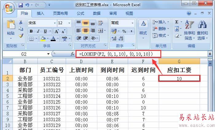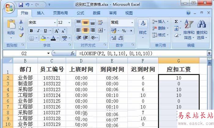 5、應(yīng)扣工資,在G2的單元格里輸入=LOOKUP(G2,{0,1,10},{0,10,10}) 這個(gè)公式即可。G2是計(jì)算結(jié)果顯示的單元格,然后在這個(gè){}里面填寫上相應(yīng)的數(shù)值,比如:遲到0分鐘,扣0元。1分鐘,扣10元。10分鐘也是扣10元。然后在計(jì)算結(jié)果G2的單元格,選中數(shù)字10向下拉,對(duì)下列單元格進(jìn)行填充計(jì)算。