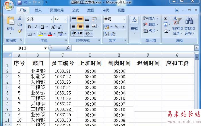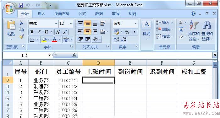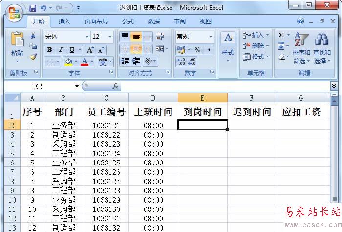 1、首先在Excel2007表格里,自己設(shè)計(jì)一份表格。表格必要的條件有,上班時(shí)間、到崗時(shí)間、遲到時(shí)間、應(yīng)扣工資,這是最基本的。