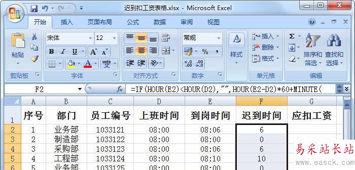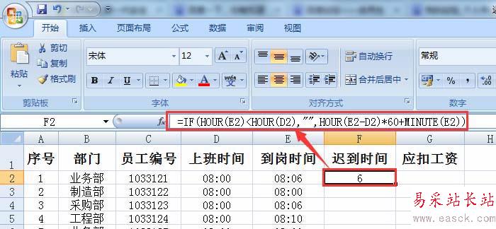 4、計(jì)算遲到時(shí)間的公式為:=IF(HOUR(F2)<HOUR(E2),"",HOUR(F2-E2)*60+MINUTE(F2))。第一個(gè)是上班時(shí)間是08:00,實(shí)際到崗的時(shí)間是08:06,所以在F2單元格計(jì)算的結(jié)果,為遲到了6分鐘。然后在計(jì)算結(jié)果6的單元格里,向下拉,對(duì)下列單元格進(jìn)行填充計(jì)算。