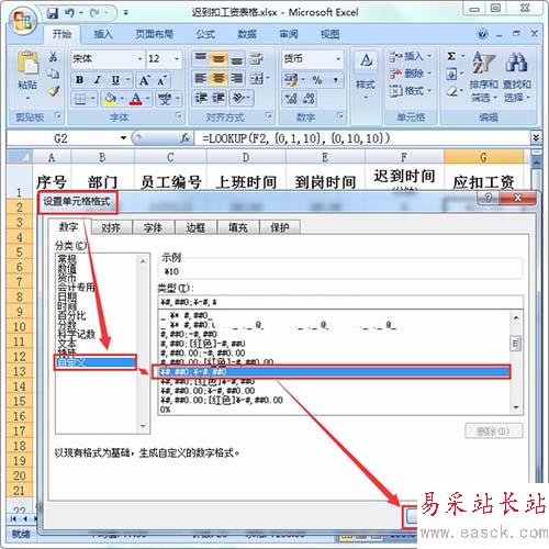 7、在應(yīng)扣工資的G2——21的單元格選中,右擊鼠標(biāo)【設(shè)置自定義】,選擇【貨幣如圖兩位數(shù)的樣式】,點(diǎn)擊【確定】。