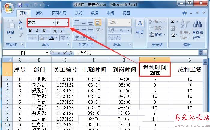 6、在A1單元格里調(diào)整一下行高,然后在遲到時(shí)間的下面,增加【分鐘】的字樣,設(shè)置字體為宋體,字號(hào)為9號(hào),這樣做表格看起來一目了然。