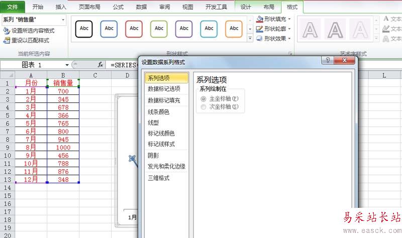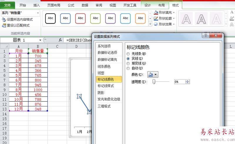 3、在顯示的折線圖中依次刪除名稱和縱坐標,執行格式命令,選擇系列“銷售量”,點擊設置所選內容格式按鈕,接著彈出的設置數據系列格式對話框。
