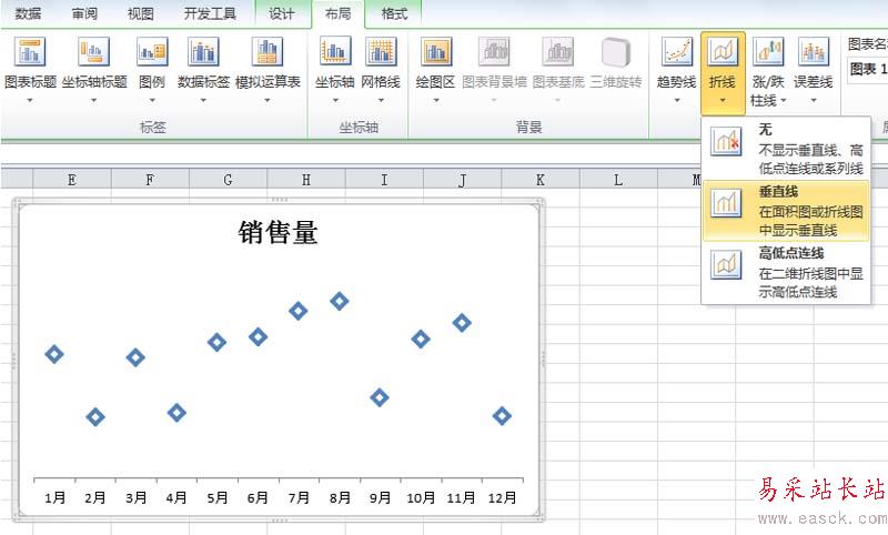 7、點擊布局菜單,從該菜單中選擇折線選項,從下拉菜單中選擇垂直線,這樣就會出現豎直的線效果。