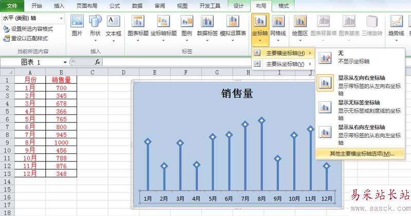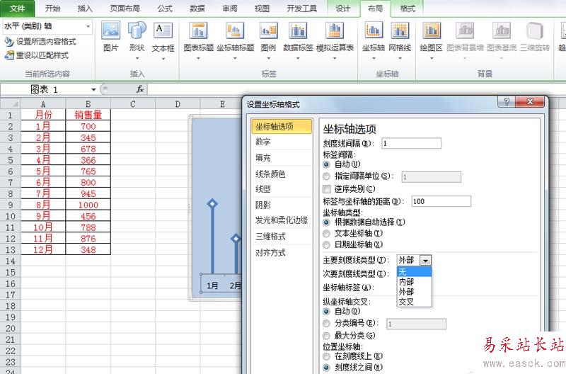 10、接著選擇橫坐標,設置字體為微軟雅黑,字號設置為9,執行布局-坐標軸-主要橫坐標軸-其他橫坐標軸選項命令,在彈出的對話框中設置主要刻度線類型為無。