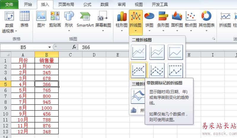 2、選擇數據區域中任意一個單元格,執行插入-折線圖命令,從中選擇帶數據標記的折線圖。