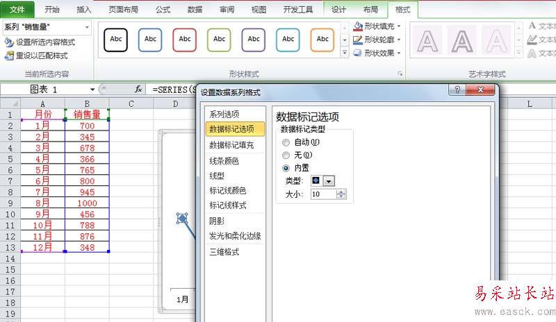 4、在設置數據系列格式對話框中切換到數據標記選項中,設置數據標記類型為內容置,類型選擇你自己喜歡的即可,大小為10。