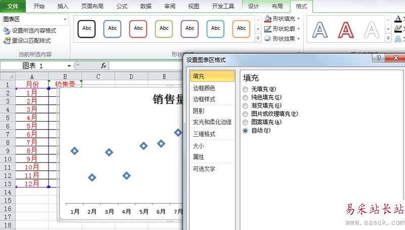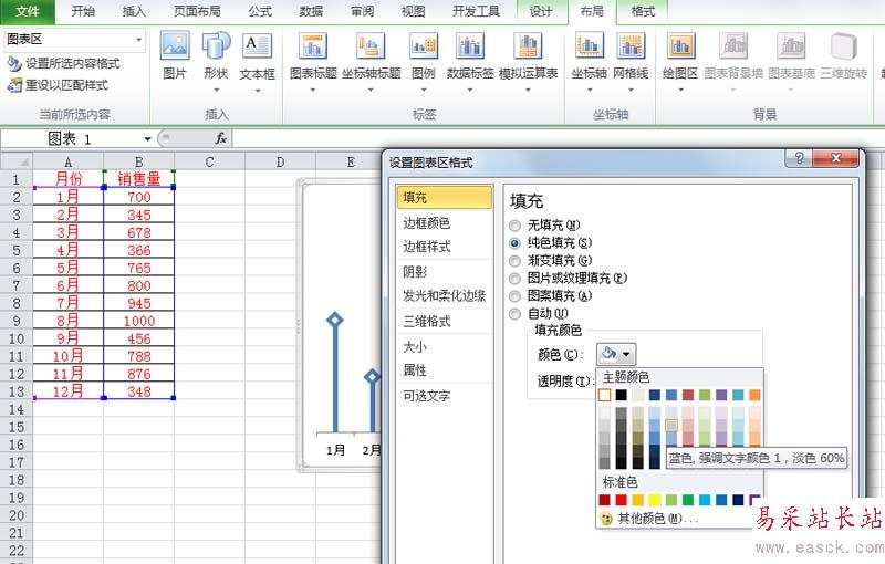 9、選擇圖表區,點擊設置所選內容格式按鈕,彈出設置圖表區格式對話框,在該對話框中設置填充為純色填充,并設置一種自己喜歡的顏色。
