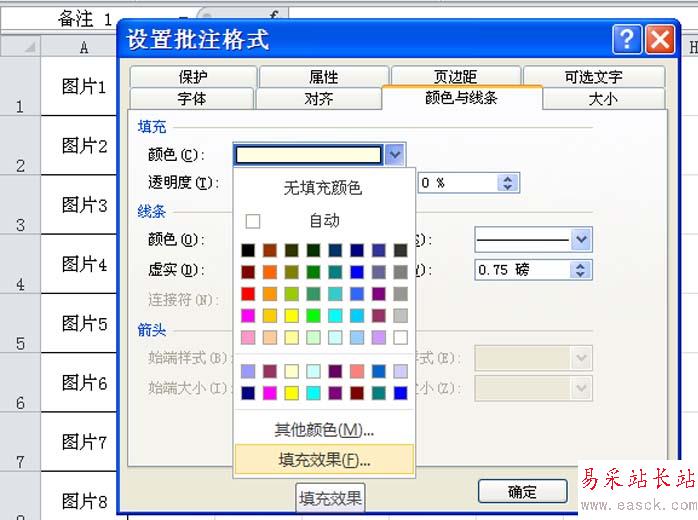 5、點擊填充顏色,從下拉菜單中選擇填充效果選項。