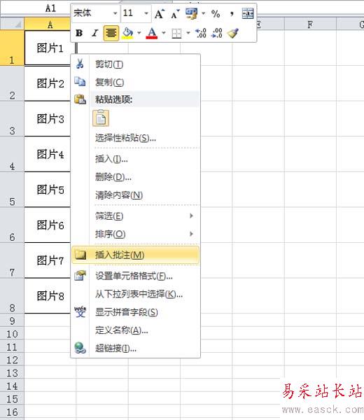 2、右鍵單擊單元格a1,從下拉菜單中選擇插入批注選項。