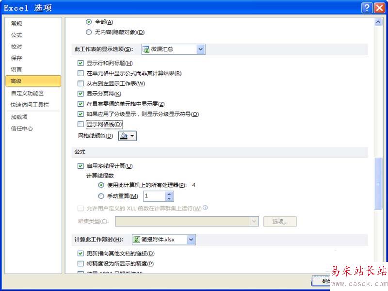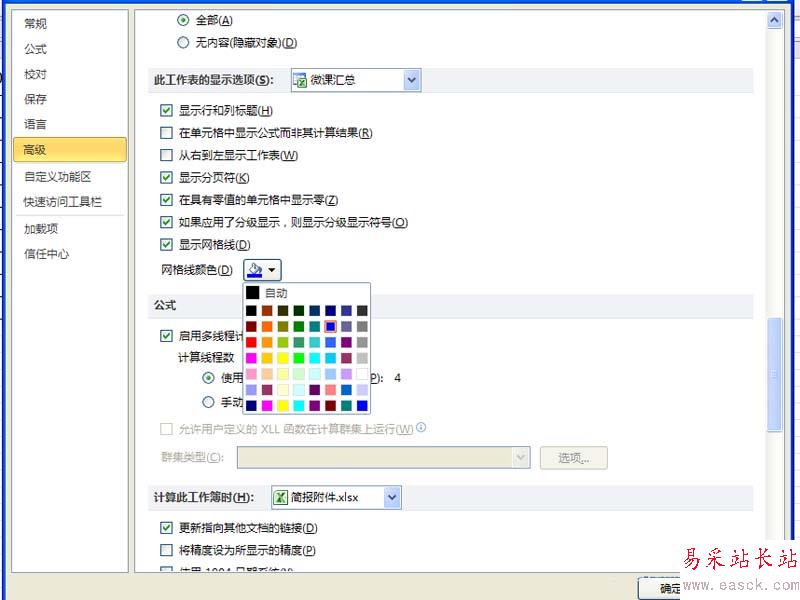 3、點擊高級切換到該選項中,往下拖動左邊的菜單,從中找到網格線顏色選項。