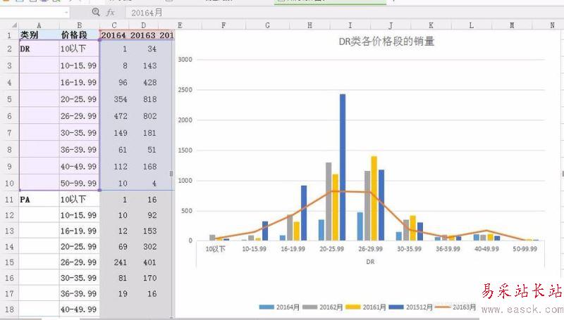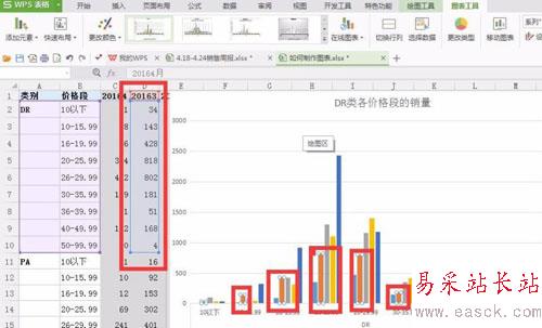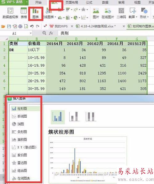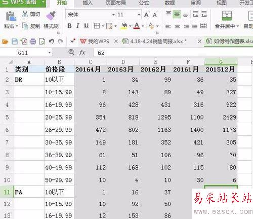 1、首先我們要打開一組我們需要的數(shù)據(jù),此數(shù)據(jù)一定要有一定的分段,否則我們讓它呈現(xiàn)2種圖形就沒有意義了,如圖所示